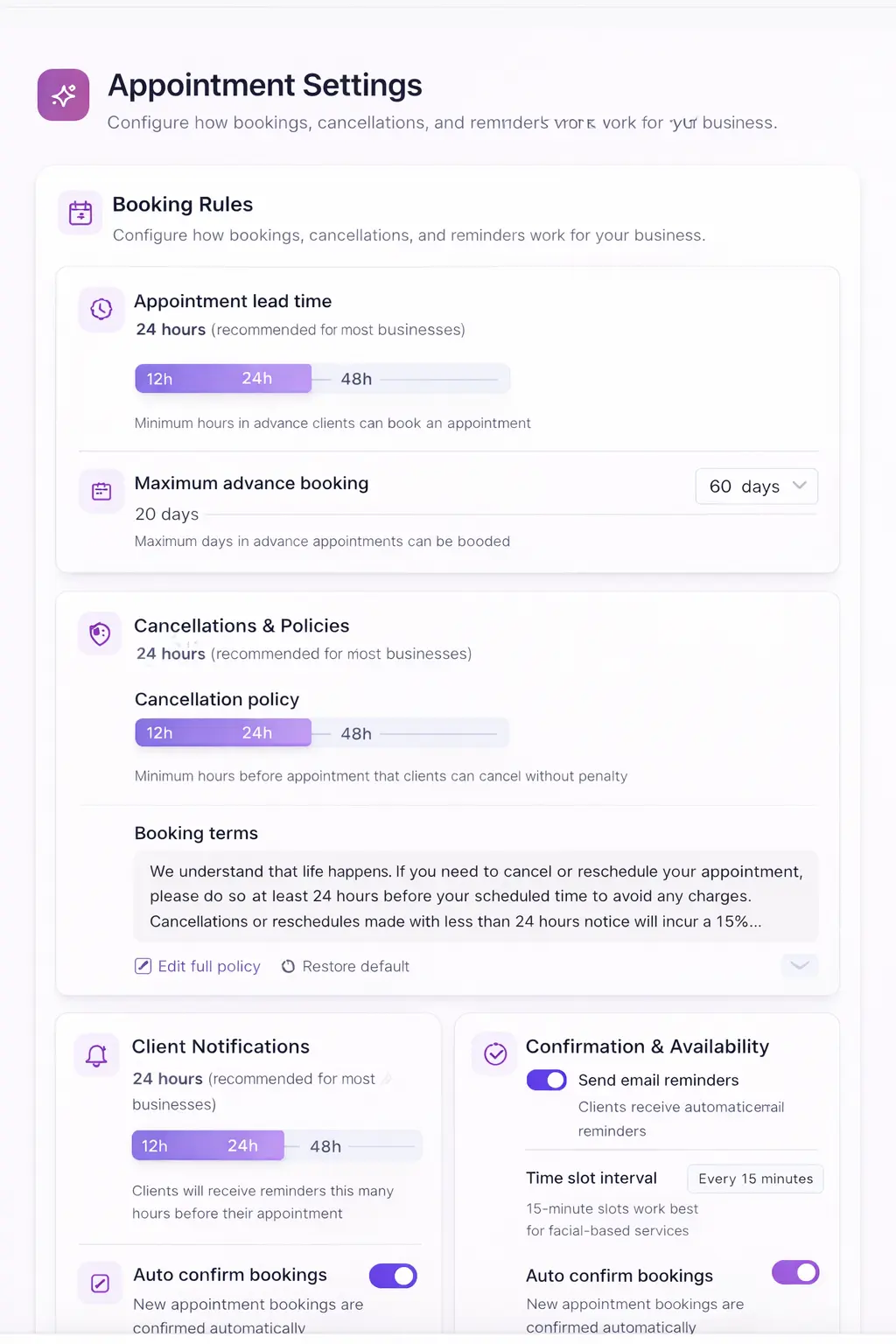 Configure once (24 hours before? 48?), then never think about it again. Reminders go out automatically for every appointment.