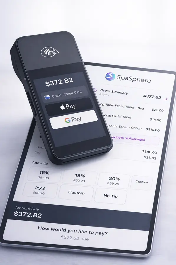 After an appointment, tap 'Checkout' in SpaSphere. Add any retail products or packages. The total appears on your reader.