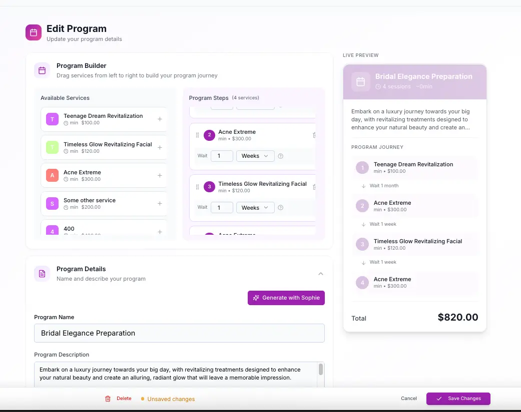 SpaSphere Treatment Programs let you design structured, goal-oriented care journeys using the services you already offer - so clients commit to outcomes, not just appointments.